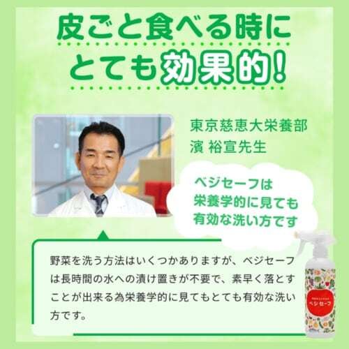 野菜類に含まれる栄養には、水溶性ビタミンや水溶性食物繊維など、水に溶けやすい性質のものが多くあります。ベジセーフは栄養が溶け出してしまう前に素早く洗浄できるよう、独自に導き出した最適なpH値にしています。水に浸す必要もなく、さっとスプレーするだけなので、野菜の栄養を損なう心配がありません。