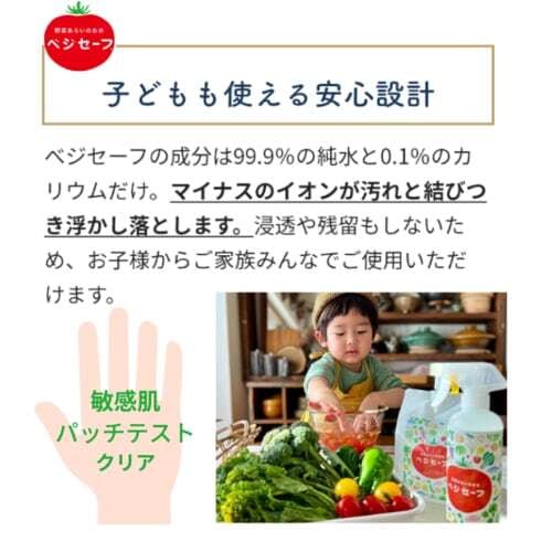 スプレーしてしばらくすると、ベジセーフは水道水と変わらないpHまで下がります。また、純水と炭酸カリウムだけでつくり、危険な化学物質は一切使用していないので安心してご使用いただけます。